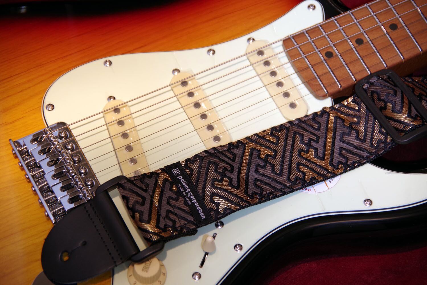 京都で生産される西陣織りの生地を使用したギターストラップです。自社工房にて製造しています。伝統柄である紗綾形があでやかなモデルです。