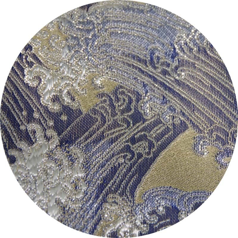 京都で生産される西陣織りの生地を使用したギターストラップです。自社工房にて製造しています。大胆な波頭の構図が映えるモデルです。