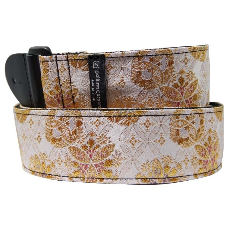 京都で生産される西陣織りの生地を使用したギターストラップです。自社工房にて製造しています。白地に伝統の七宝柄が金糸で表現された艶やかな柄です。
