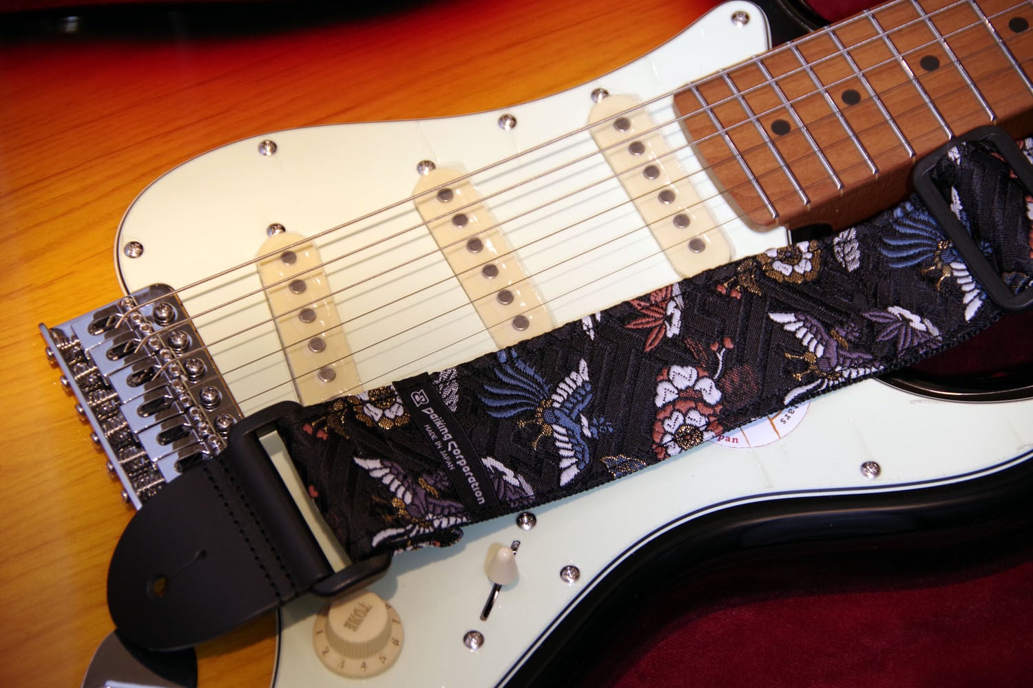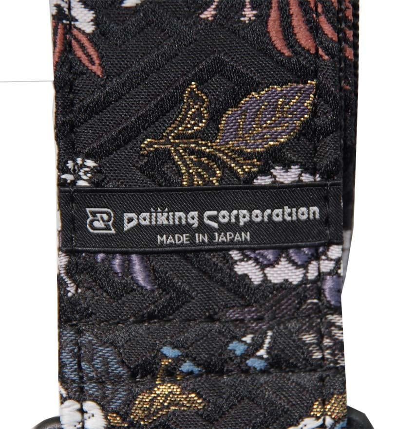 京都で生産される西陣織りの生地を使用したギターストラップです。自社工房にて製造しています。黒字に紗綾形が施され、2種の鳳凰が描かれた落ち着いた色柄です。