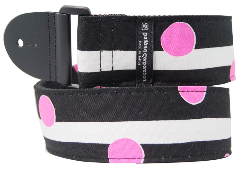 自社工房にて製作した日本製のストラップ。ネオンドットピンク柄。コットン100%。