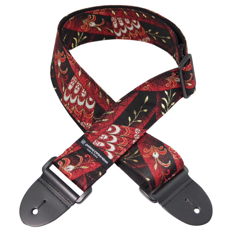 京都で生産される西陣織りの生地を使用したギターストラップです。自社工房にて製造しています。赤色の下地に羽根模様が描かれたデザイン。