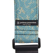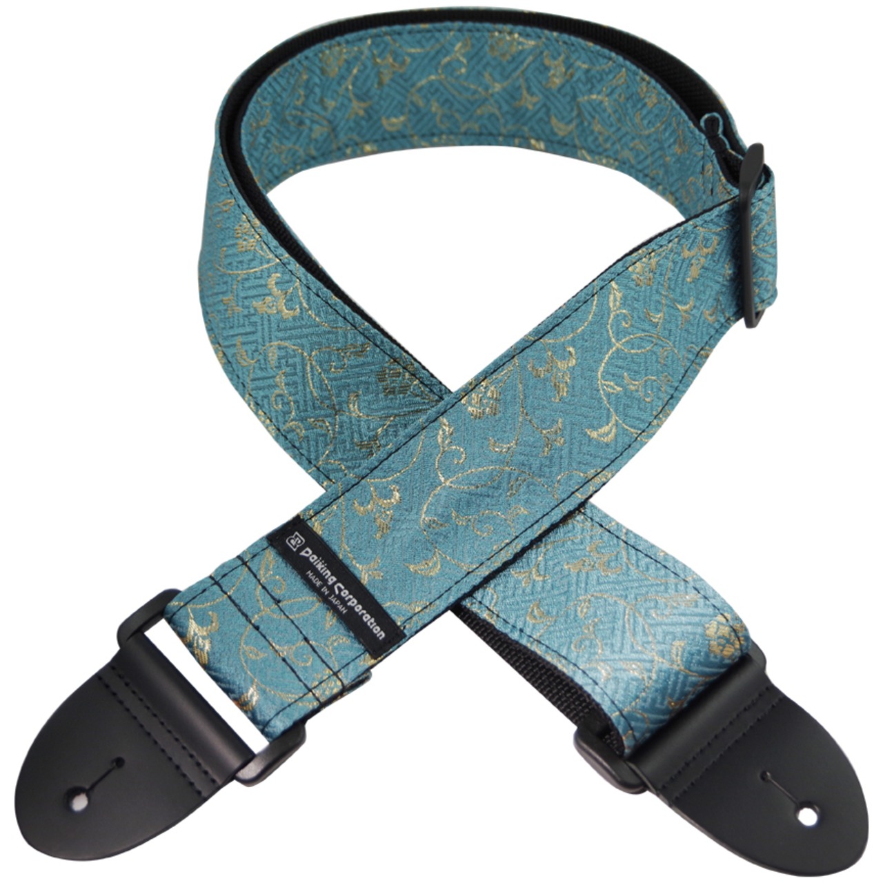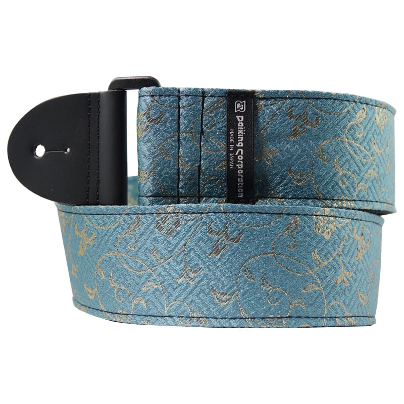 京都で生産される西陣織りの生地を使用したギターストラップです。自社工房にて製造しています。青色の下地に唐草模様が金色で描かれたデザイン。