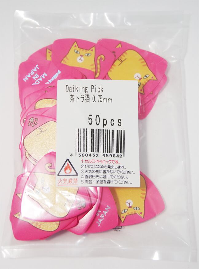 Daikingオリジナルデザインの茶トラピックトライアングル厚さ0.75mmの50枚パックです。突然ですが有名メーカーのギターピックはほとんどが日本製では無いです。日本製との違いは材質の精度の違いです。研磨、耐久性、印刷の精度、印刷の耐久性もです。持ったときのフィーリングが1番大事なのでいちがいに国による違いだけではありませんが、できるだけ品質の良いものが欲しい方にはおすすめできるピックです。